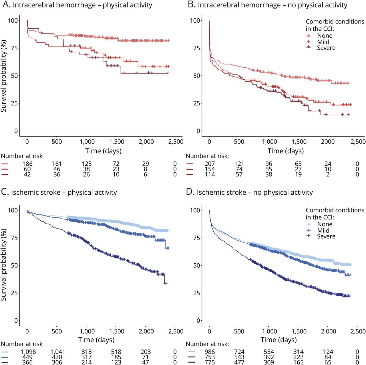 Kaplan-Meier curves for poststroke survival stratified by comorbidity. Cumulative survival stratified by the weighted CCI as no comorbidity (0 factors), gentle comorbidity (1–2 factors), and extreme comorbidity (>2 factors) for (A) bodily lively sufferers with intracerebral hemorrhage, (B) inactive sufferers with intracerebral hemorrhage, (C) bodily lively sufferers with ischemic stroke, and (D) inactive sufferers with ischemic stroke. CCI = Charlson comorbidity index. Credit score: Neurology (2022). DOI: 10.1212/WNL.0000000000201097